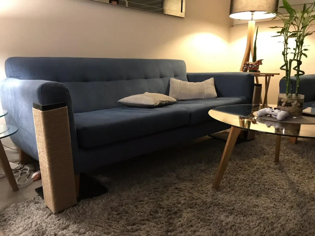 - Simplemente levantas la esquina del sillón y luego pones el rascador, su base plana quedará pisada con la pata del sillón.