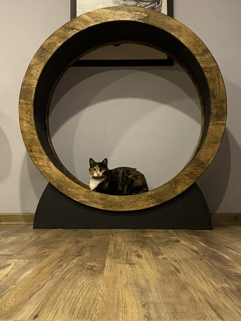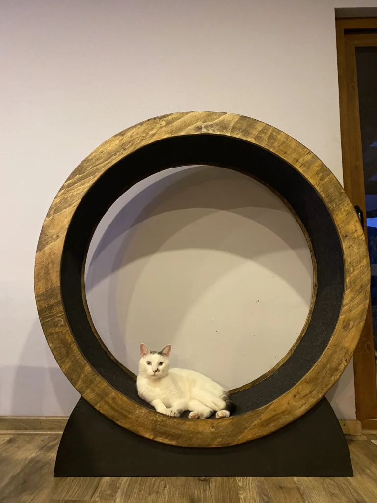 La rueda ParaGatos combina materiales nobles y una estética moderna que se adapta a distintos espacios, convirtiéndose en un elemento que no desentona, sino que aporta carácter.